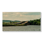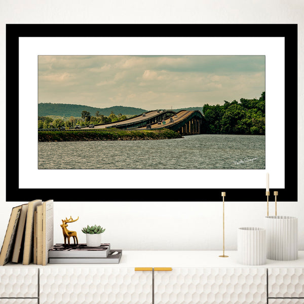 The photo features a subtle, naturalistic color tone, lending it a timeless, cinematic quality that beautifully balances man-made infrastructure with natural landscape. It's the perfect piece for anyone who appreciates scenic photography, road trip nostalgia, and tranquil views that provide a sense of escape and journey.