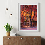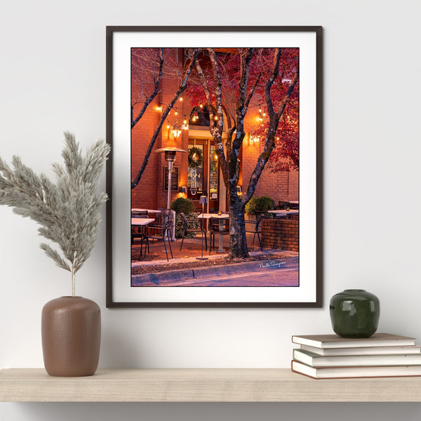 The scene feels calm and intimate—an after-hours pause where light, texture, and architecture come together. The empty seating and gentle reflections on the pavement evoke the charm of Huntsville’s downtown evenings, blending Southern hospitality with timeless urban character.