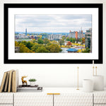 Capture the beauty of Huntsville, Alabama with this vibrant cityscape photograph, showcasing the heart of downtown framed by rich autumn colors. The crisp architecture, sparkling water features, and golden fall foliage blend seamlessly under a soft, cloud-filled sky.