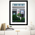 The main entrance is also fronted by a large stone staircase and landscaping, with a contemporary sculpture visible on the steps in one of the wider views.
