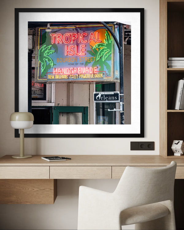 Bring home the fun, flavor, and iconic glow of New Orleans nightlife with this vibrant photography print featuring the famous Tropical Isle neon sign — home of the legendary Hand Grenade, known as “New Orleans’ Most Powerful Drink.”