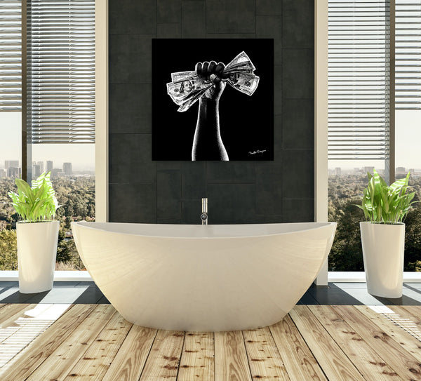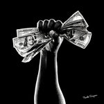 Capture the raw urgency of financial independence with this arresting black and white print. The photograph features a fist raised high, powerfully clutching a wad of dollar bills, symbolizing ambition, control, and economic freedom. The stark, high-contrast lighting transforms the arm into a sculptural form, emphasizing the strength required to grasp prosperity.
