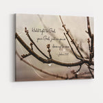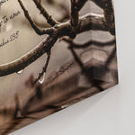 Find quiet strength in this tranquil and grounding art print. A close-up view of winter tree branches captures the rugged beauty of nature, with tiny water droplets and remnants of spiderwebs suggesting perseverance through difficult seasons. The soft, misty background creates a warm, atmospheric glow.