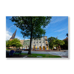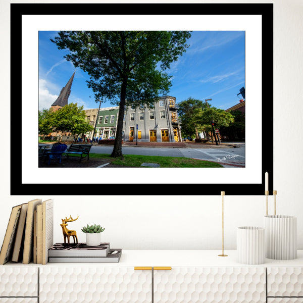 Celebrate the eclectic charm of Downtown Huntsville with this lively street scene featuring the iconic Green Bus Brewing. Nestled at a bustling intersection, this photograph captures the blend of historic architecture, modern flair, and community spirit that defines Alabama’s urban heart. From the triangular building with golden-framed windows to the church steeple rising in the background, every detail invites viewers into a space where tradition meets creativity.