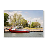 Celebrate the spirit of community service and dedication with this vibrant photograph of the Guntersville Fire/Rescue Marine 1 vessel. Captured on a sunny day at the dock, the image features the classic red and white rescue boat ready for action on the water. The backdrop includes lush, springtime greenery, a bright sky, and the American flag flying proudly, creating a powerful sense of local pride and security.
