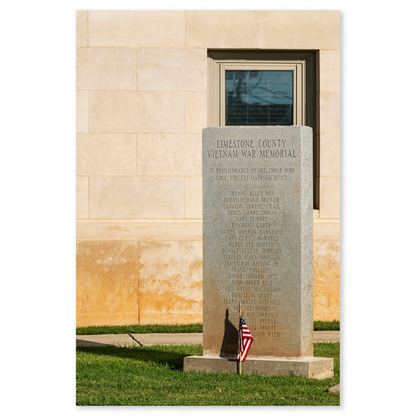 Photo by Neville Simpson.This photograph features the Limestone County Vietnam War Memorial in Athens, Alabama, a solemn tribute honoring the men who gave their lives in service during the Vietnam War. The engraved stone monument stands quietly against the courthouse backdrop, its weathered surface and carved names reflecting both sacrifice and remembrance.