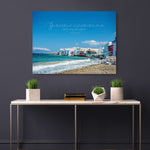 Flowing across the sky is the elegant scripture from Psalm 136:1, 6: "Give thanks to the Lord... who laid out the earth above the waters, for his mercy endures forever."This print is a magnificent reminder of God's everlasting mercy set against the grandeur of creation. It brings a feeling of peace, gratitude, and Mediterranean elegance to any living room, entryway, or sunny office space.