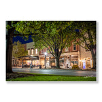 Capture the warmth and vibrancy of small-town charm with this stunning nighttime street scene. This high-resolution image features historic brick buildings aglow with inviting interior lights, bustling outdoor seating under string lights, and lush green trees lining a quiet, well-kept street.