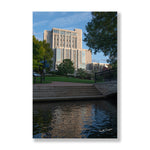 Celebrate the modern elegance of Huntsville, Alabama with this striking photograph of the City Hall building, nestled beside the serene beauty of Big Spring Park. Featuring sleek architecture, lush greenery, and a tranquil water reflection, this image captures the harmony between urban design and natural surroundings. The stone bridge and directional signs add depth and character, inviting viewers into a peaceful civic landscape.