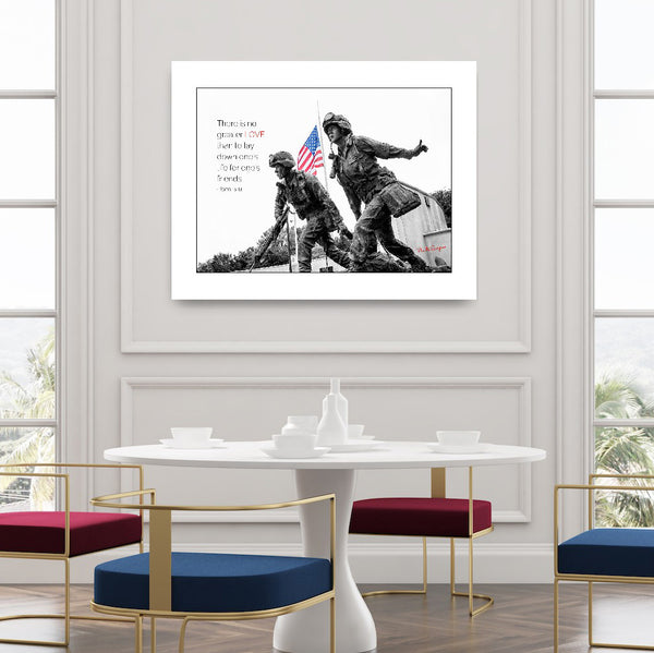 The striking black-and-white tones, punctuated by the red in the quote and the flag, make this work by Neville Simpson a moving tribute to valor, friendship, and sacrifice. It's a deeply meaningful piece for a veteran, military family, or anyone honoring the spirit of selflessness.