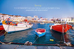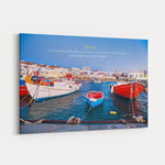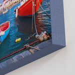 Step into the vibrant charm of a Greek seaside marina with this captivating photograph featuring red and blue boats gently resting on the water, set against a picturesque oceanside cityscape.